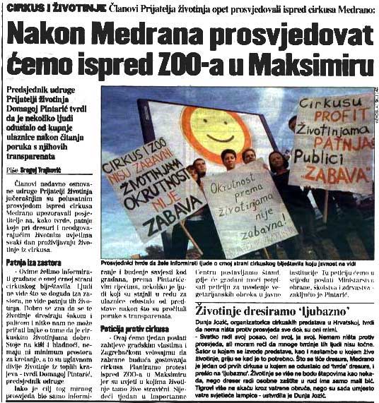 Obavještavamo vas da danas 25.09.01. u 19 sati udruga Prijatelji životinja organizira miran prosvjed ispred cirkusa Medrano na Zagrebackom Velesajmu zbog nepotrebnog zlostavljanja životinja u cirkusima za ljudsku zabavu.