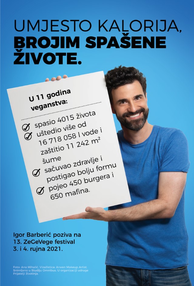 Pojašnjavaju da slogan na plakatima ujedno ukazuje na činjenicu da je veganska prehrana zdravija i pomaže održavanju željene težine: „Koristi za zdravlje su brojne: od smanjenja rizika od kardiovaskularnih bolesti i moždanog udara, sniženja krvnog tlaka i razine kolesterola u krvi do smanjenja rizika od karcinoma debelog crijeva i prostate. Vegani koji se većinski hrane cjelovitim žitaricama, mahunarkama, voćem i povrćem imaju manji indeks tjelesne mase, pa uz takvu prehranu uistinu mogu zaboraviti na brojanje kalorija i početi brojati spašene živote.” Pozivaju sve da isprobaju veganske specijalitete na 13. ZeGeVege festivalu koji će se održati na zagrebačkome Trgu bana Jelačića 3. i 4. rujna 2021.