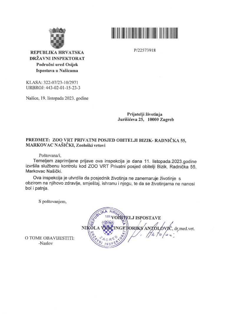 29. rujna 2023. podnijeli smo prijavu i zatražili inspekcijski nadzor Zoološkog vrta obitelji Bizik.
