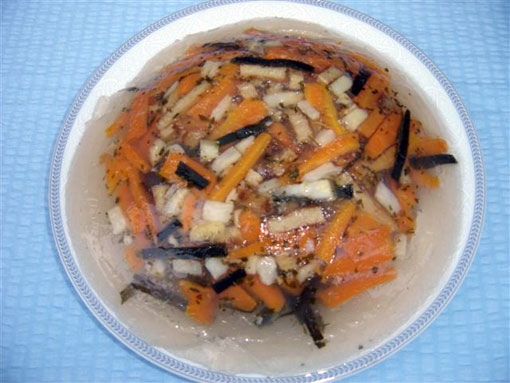 U vodi prokuhati povrće. U drugi lonac u 1 litru vode dodati sol i pektin. Kad voda provrije, uz miješanje kuhati još 3 minute. Dodati povrće, promiješati i ostaviti na hladnom.