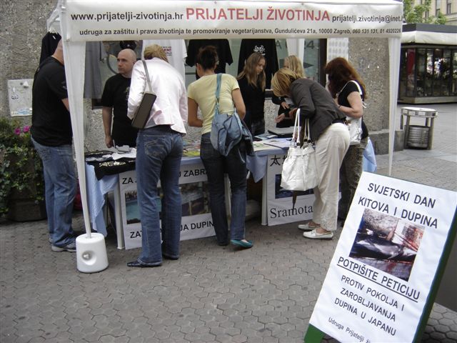 Na informativnom štandu, koji će u subotu, 30. lipnja, od 10 sati biti postavljen na uglu Varšavske ulice i Trga Petra Preradovića, a na kojem će se prikazivati film o pokolju dupina, članovi Udruge dijelit će prigodni letak napravljen povodom obilježavanja Svjetskog dana kitova i dupina te biti na raspolaganju svim zainteresiranima s dodatnim informacijama.