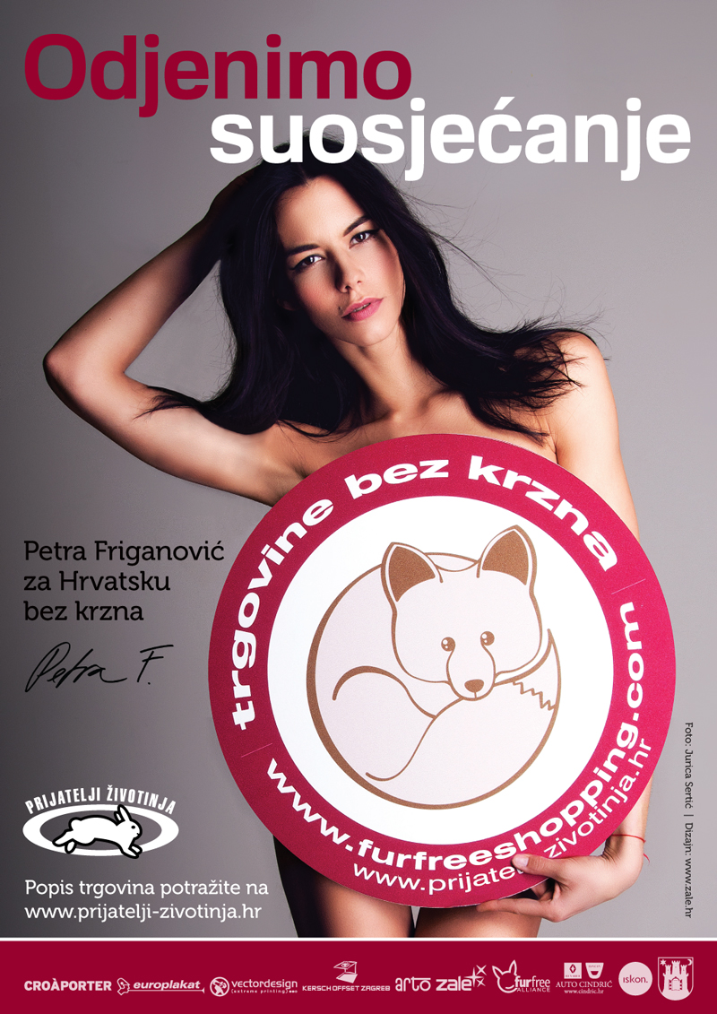 Promociji projekta 'Trgovine bez krzna' priključila se uspješna manekenka i vegetarijanka od rođenja Petra Friganović, koja će se ovoga mjeseca pojaviti na plakatima Prijatelja životinja. Fotograf Jurica Sertić, također vegetarijanac, snimio je Petru Friganović za vizual 'Odjenimo suosjećanje' kojeg je izradila Maja Zaklan iz Dizajn studija Zale, dok se za šminku pobrinula Valentina Pavlaković.