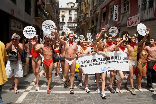 Pristaše PETA-e pisali su gradonačelnici Pamplone, tražeći od nje da prihvati novu tradiciju - veselu, golu 'Ljudsku trku' - i da okonča zlostavljanje bikova koji užasnuti pate i često pretrpe ozbiljne povrede kada se poskliznu i padnu dok ih se prisiljava na jurnjavu popločanim ulicama. Unatoč rastućem preziru Španjolaca prema borbi bikova - što se odrazilo i nedavnim glasovanjem Gradskog vijeća Barcelone da zabrani ovaj primitivni, krvavi sport - te tisuća pritužbi iz cijeloga svijeta koje su preplavile njezin ured, gradonačelnica Pamplone nije odgovorila na zahtjev PETA-e.