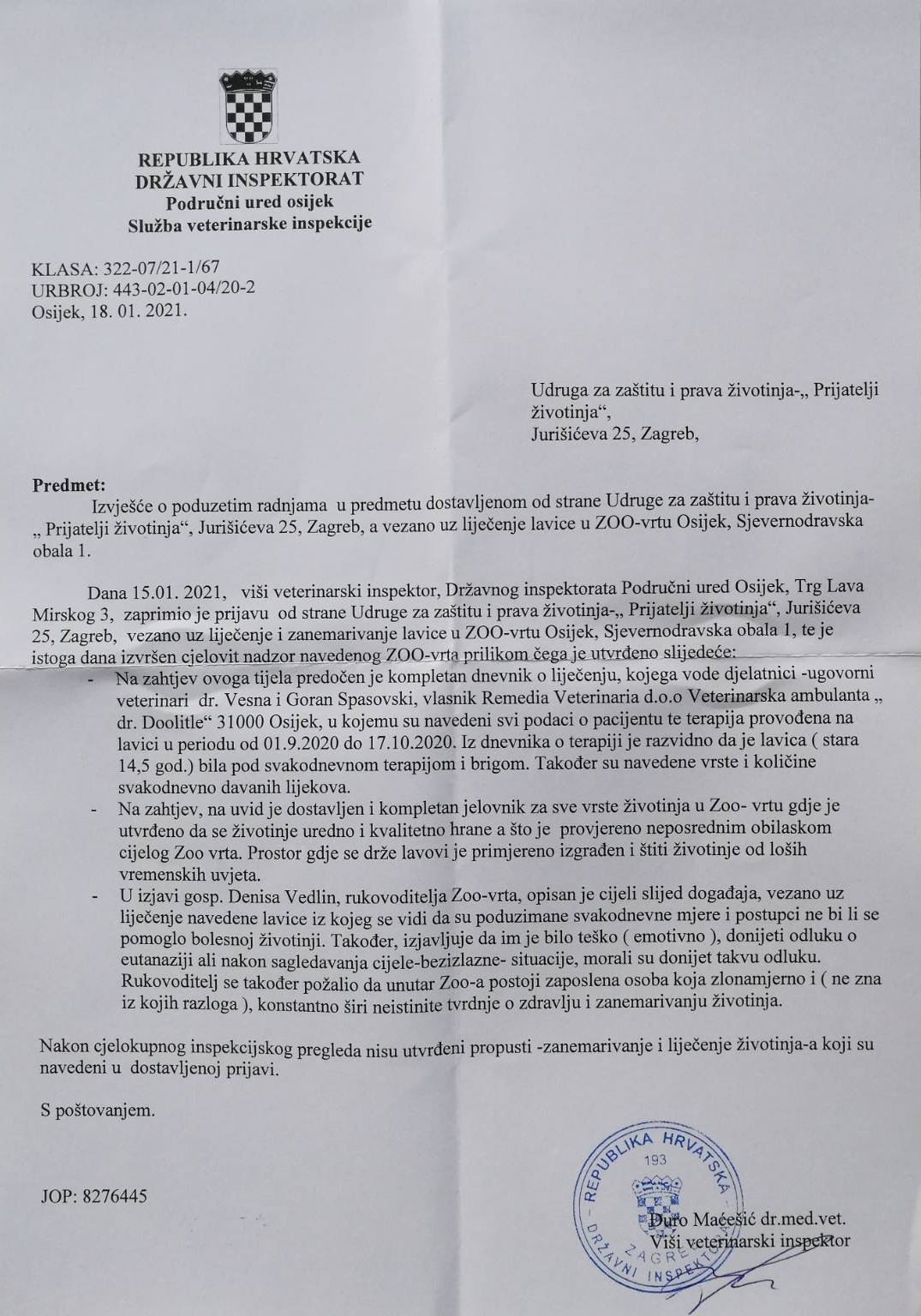 Odgovor veterinarske inspekcije zaprimljen 18. siječnja 2021.: