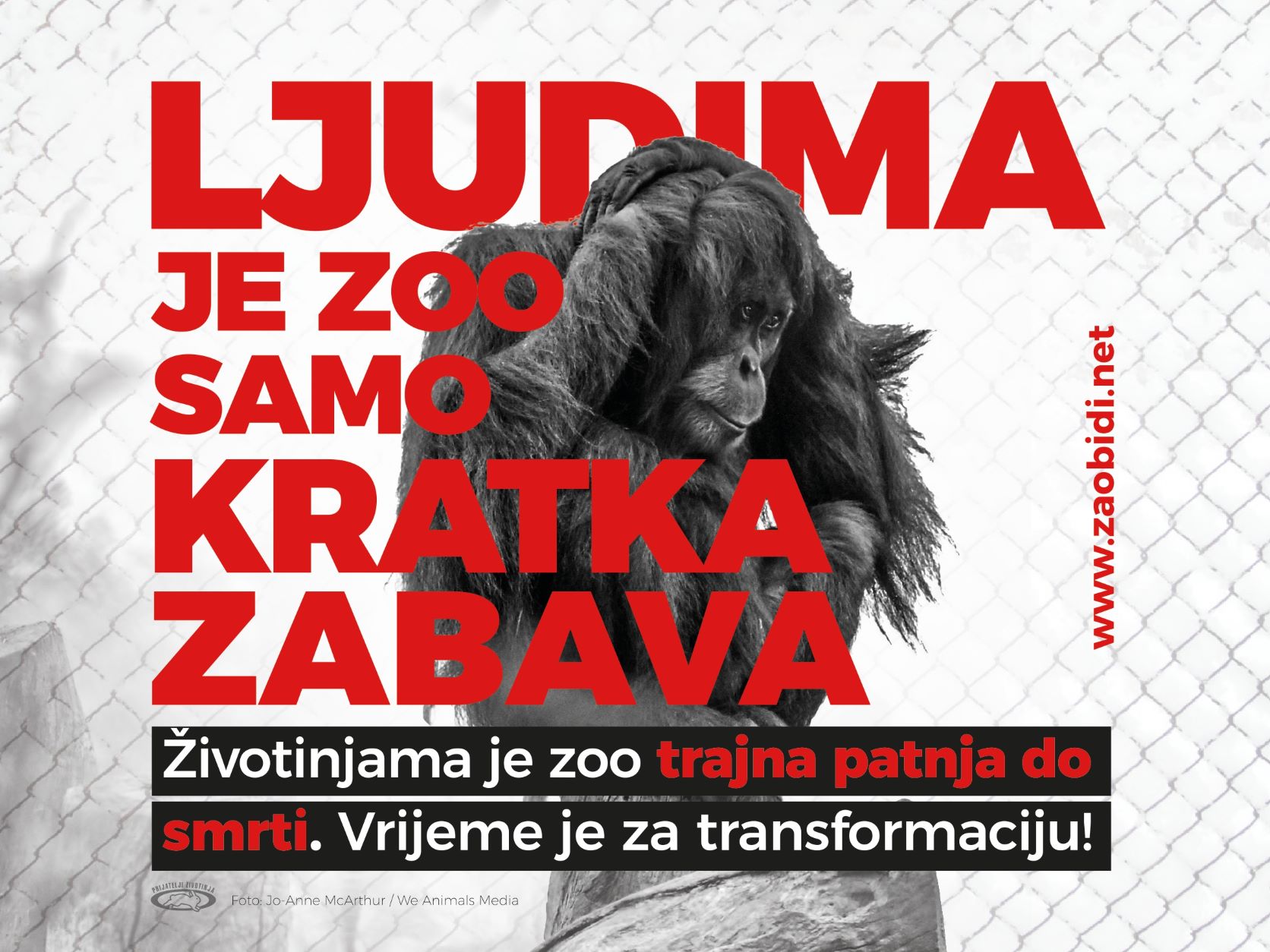Malo tko ostaje ravnodušan pred potresnim vizualom s moćnom porukom: „Ljudima je zoo samo kratka zabava. Životinjama je zoo trajna patnja do smrti. Vrijeme je za transformaciju.” Plakati udruge Prijatelji životinja u Zagrebu, Varaždinu, Puli, Rijeci, Splitu i Zadru nastavak su kampanje „Zaobiđi zoološki” kojom se građani pozivaju da se educiraju o realnosti zooloških vrtova. Prošle godine Prijatelji životinja poručili su s plakata svima da zaobiđu zoološke vrtove, a u svibnju ove godine ukazali da svi plaćamo patnju životinja u zoološkim vrtovima, čak i ako ih ne posjećujemo, jer gradovi troše milijune za održavanje tih mučilišta za životinje.