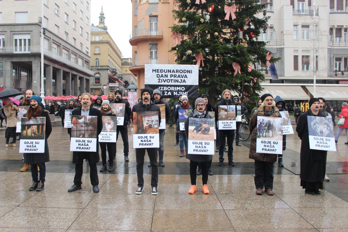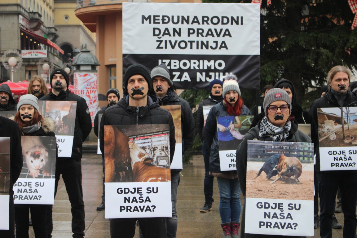Povodom Međunarodnog dana prava životinja, Prijatelji životinja održali su danas dojmljiv performans kojim su privukli pozornost na one koji se ne mogu izboriti sami za sebe. Aktivisti zavezanih ruku i s crnim trakama preko usta, uz potresne fotografije životinja koje pate zbog iskorištavanja i ubijanja za ljudske ciljeve te transparente s pozivom da se izborimo za njihova prava, ukazali su na nepravde koje životinje svakodnevno proživljavaju. Vjeruju da su ovim performansom potaknuli prolaznike na razmišljanje o etičkim aspektima našeg odnosa prema životinjama.