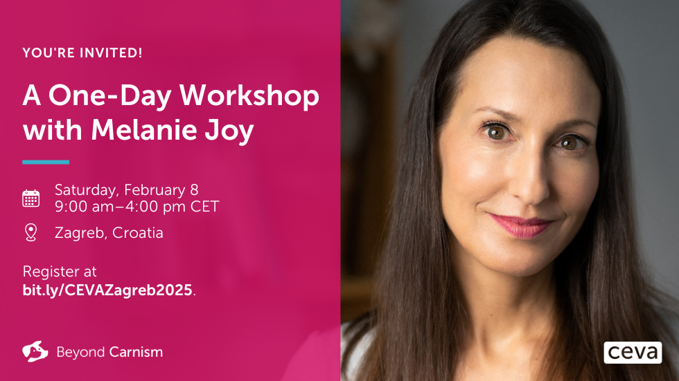 Njezina slavna autorica, dr. Melanie Joy, dolazi u Hrvatsku 8. veljače 2025. kako bi u prostoru udruge Prijatelji životinja (Jurišićeva ulica 25, Zagreb) održala jednodnevnu radionicu Centra za učinkovito vegansko zagovaranje (CEVA). Joy je autorica sedam knjiga i nagrađivana edukatorica. Specijalizirala se za učinkovito zagovaranje, društvene promjene, međuljudske odnose i komunikaciju, a njezin rad predstavljen je u vodećim medijima diljem svijeta. Dobitnica je brojnih priznanja uključujući nagradu Ahimsa, koja je prethodno dodijeljena Dalaj Lami i Nelsonu Mandeli, za svoj rad na promicanju globalnog nenasilja. Melanie Joy održala je predavanja i treninge u više od 50 zemalja, a ujedno je osnivačica organizacije Beyond Carnism.